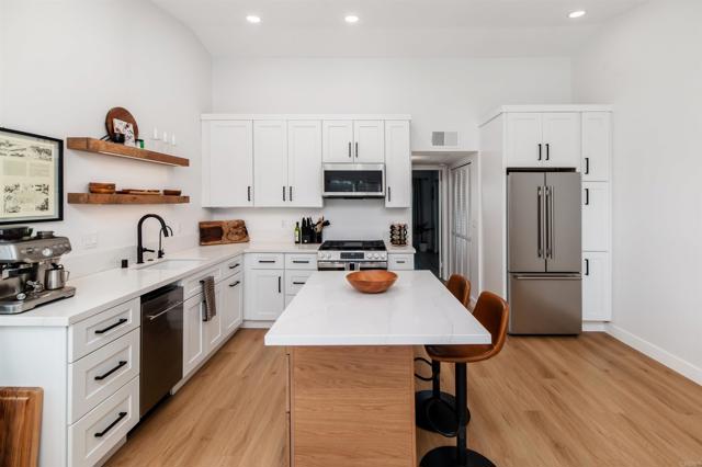 Move right in and enjoy a light-filled, beautifully updated home featuring a recently renovated kitchen with quartz countertops and sleek stainless steel appliances. The kitchen was thoughtfully opened to create a spacious great-room layout, complemented by new engineered wood flooring throughout. The bathroom has also been refreshed with new designer fixtures, adding a polished, modern touch. Experience elevated living in this top-floor, 1-bedroom condo with soaring ceilings, located in the desirable gated Viewpoint community. The home offers breathtaking views across San Diego, a warm and inviting fireplace, and a refined yet comfortable ambiance, with a peek of ocean views from the front door. The residence has been extensively upgraded with careful attention to detail. Central air conditioning provides year-round comfort, while an in-unit washer and dryer add everyday convenience. Elevator access makes reaching the top floor effortless. Step out onto the private balcony to take in sweeping views of Mission Valley and the surrounding hills. Residents enjoy a secure, gated environment with controlled entry and a gated driveway for added peace of mind. Ideally positioned above Mission Valley and just west of Normal Heights, the location offers quick freeway access and is minutes from Mission Valley and Fashion Valley shopping, dining, the Trolley Barn, and public transit to SDSU. This home includes one assigned, uncovered parking space and delivers a perfect balance of style, comfort, and connectivity. Welcome home!
